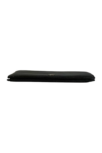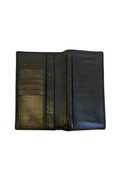 Chanel portemonnee in zwart lamsleer. De binnenkant is ook zwart en de hardware is zilverkleurig. De portemonnee wordt ook geleverd met een doos. Dit is een portemonnee met klep, wat betekent dat er geen drukknop is om de portemonnee te sluiten. De binnenkant is voorzien van acht kaartsleuven, vijf steekvakken voor briefgeld en papiergeld en een vak met ritssluiting voor munten. Het serienummer is duidelijk leesbaar. De algehele staat is goed, zowel van binnen als van buiten zien er nog zeer goed uit. Deze portemonnee is te vinden in onze winkel aan de Nieuwe Spiegelstraat 27 in Amsterdam of direct online te kopen. Aanvullende informatielÉtoile referentienummer: NSCAW140 AfmetingenHoogte: 10,5 CMBreedte: 18 CMDepte: 2 CM