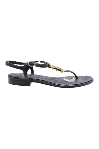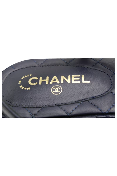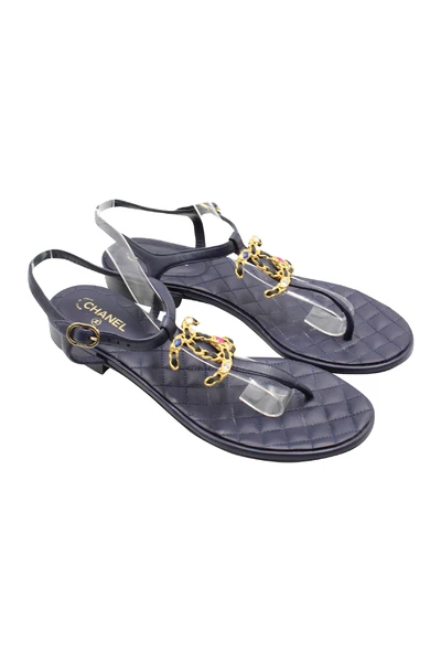 Deze prachtige string-sandalen zijn voorzien van marineblauw gewatteerd lederen bovenwerk met een lederen hielkussen en een T-riem versierd met het kenmerkende CC-logo van Chanel. Dus tijdloos en stijlvol met prachtige details! Chanel Thong Strappy Sandalen in marineblauw leerconditie: Zeer goed teken van slijtage: vuil en slijtage op zolen, Insole Dirt Stain Materiaal: Lederen Kleur: Marineblauw Maat: 38 SKU: 166897