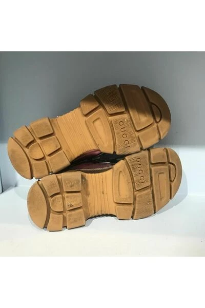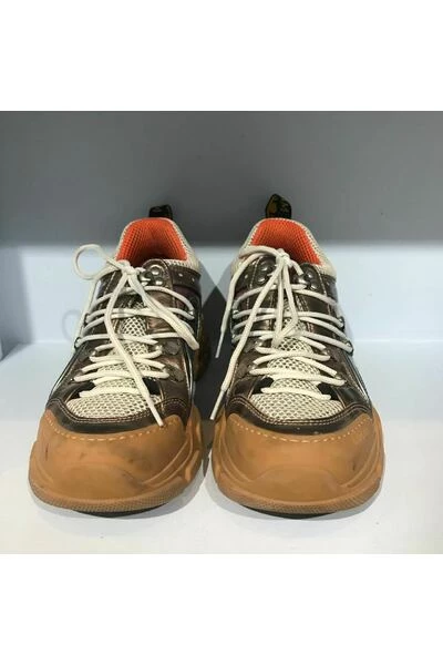 Gucci-sneakers, Flashtrek-model. Maat 38.5. Bruine sneakers met veters van rubber, leer en canvas. Zeer goede staat, enkele markeringen op de uiteinden (zie foto).