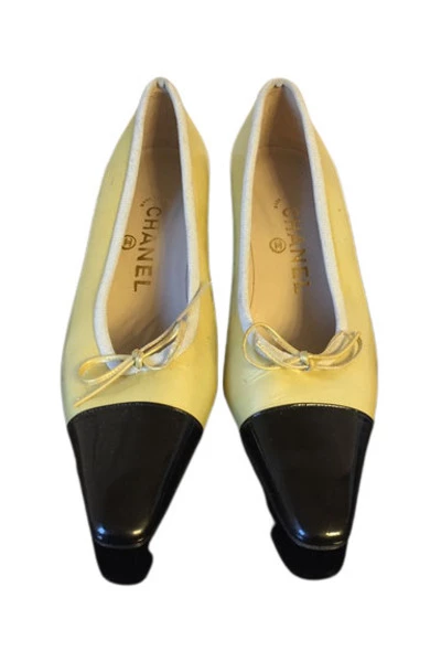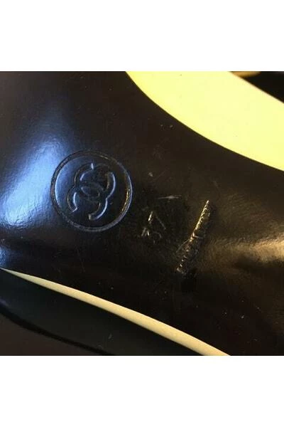 Vintage Chanel pumps in lichtbeige lakleer en zwarte punten. Kleine hakken. Maat 37 Nieuw nooit gedragen maar vlekken op het leer