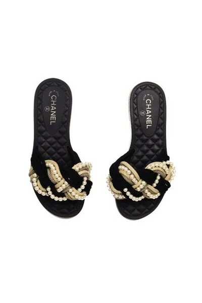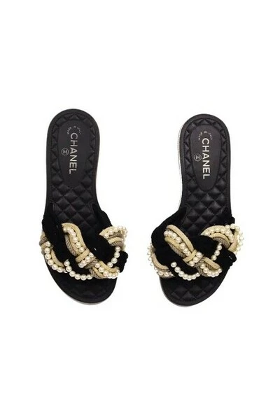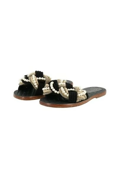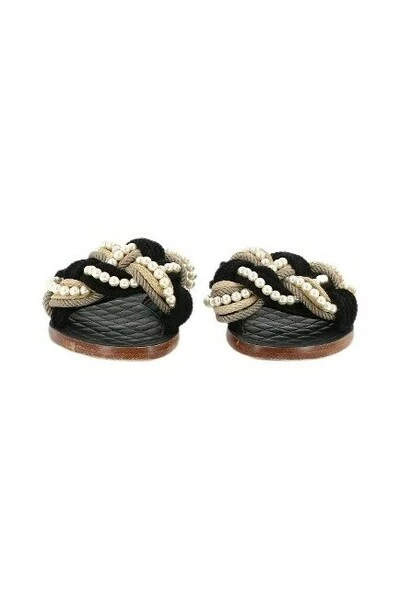 Chanel Sandalsfree Cuba Modelquilted kalf Leatherblacktwisted Pearls en Black, Beige en Khaki Cordsize 40 Worn InsoleSvery Good Condions Lold zonder dekking, met doos