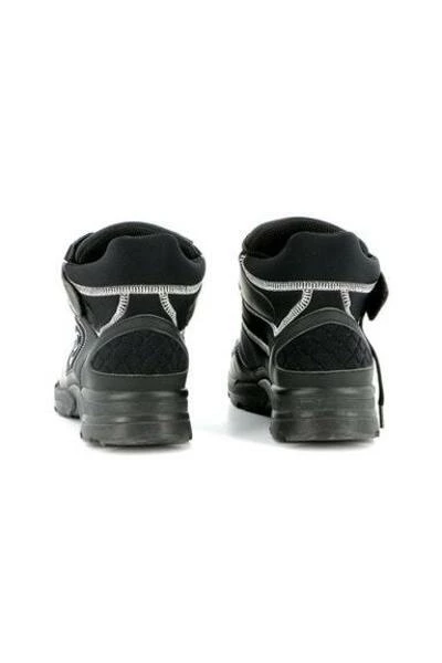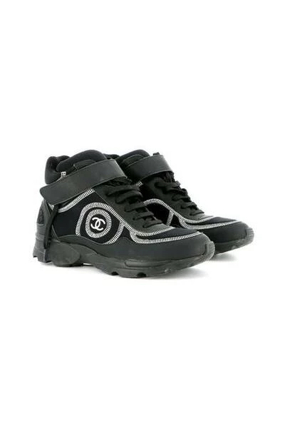 Chanel sneakersTechnische stofWit stikselZwarte rubberen zool Kras op de voorkantCC-logo op de zijkantMaat 36Slechte zolenVerkocht met originele stofzak, geen doos