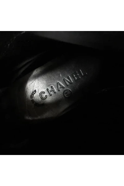 Merk: ChanelCategory: ShoessubCategory: BootScolor: Silvermaterial: Leer, Patent LeatherAccessories: Boxdesign: Zonder rits Geslacht: vrouwen SSIZE: 38 (ongeveer US7.5) Opmerking: (Accessoires) Box: Dirt Marksize: Insole (Lengte): 9.36