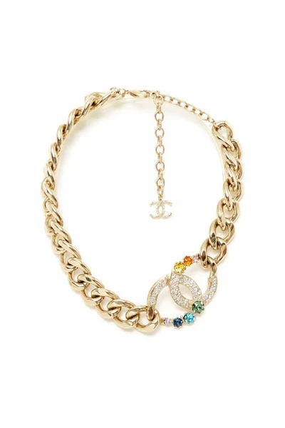 Chanel kettingcollectie PE2019 in enigszins verguld metaal met het motief van een grote ketting met toenemende schakels afgewisseld met een CC -logo ingelegd met veelkleurige strass, gesloten door een karabijnhaak aan een ketting en zijn acroniem CC. Lengte 40 cm exclusief ketting en 53 cm met ketting, breedte van ketting 1,85 cm, afmetingen van CC 5 x 3,8 cm. De ketting wordt geleverd zonder factuur of originele verpakking, maar het is nooit gedragen en het is geweldig voor elke dag, geleverd in een mooie Chanel -doos.