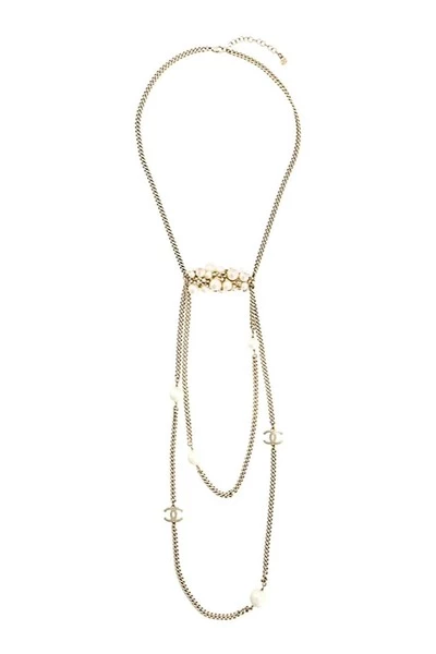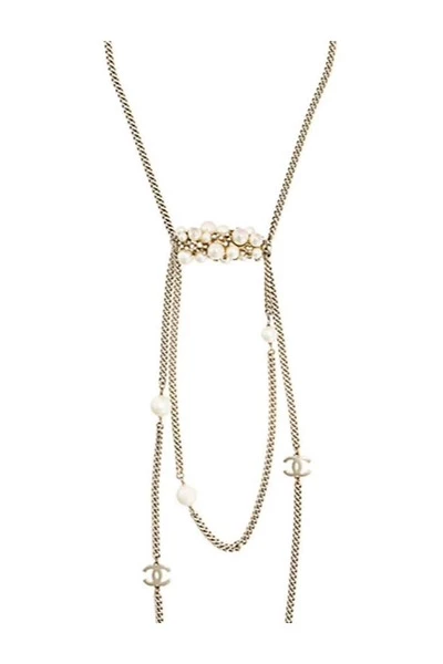 Metalen Chanel gelaagde sautoir-ketting uit 2004 met een karabijnsluiting, een lange lengte, een gelaagd ontwerp, strass-versieringen, zilverkleurige hardware, parelversieringen en kenmerkende in elkaar grijpende CC-logos. Gemaakt in Frankrijk. Maxi-lengte: 37,7 inch (96 cm)