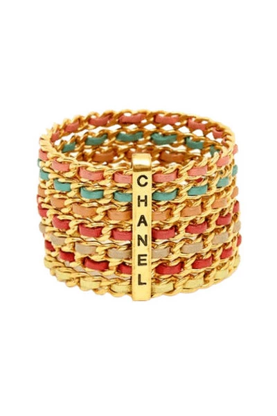 Bracelet Chanel Collection Cruise 1993 bestaande uit 7 armbanden in keten van stijve gouden metaal verweven met leer van verschillende pastelkleuren, bij elkaar gehouden door een band van metalen gegraveerde Chanel. Binnendiameter van de armbanden ongeveer 7 cm, hoogte van de armband 5,5 cm. Het metaal heeft sporen van gebruik en lichte oxidatie vanwege zijn leeftijd, maar het geheel is in uitstekende staat, verzamelaar voor alle mooie dagen.