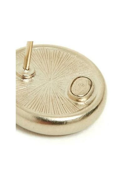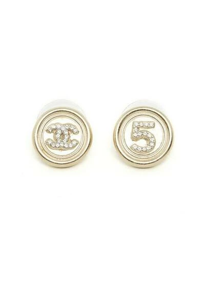 Chanel oorbellen gouden metalen nagels met het motief van een ronde overwonnen door een kleine CC of een 5 ingelegd met witte steentjes. Diameter 1,45 cm. De oorbellen worden geleverd zonder verpakking of originele factuur, maar ze zijn in zeer goede staat, chic en helder voor het gezicht.