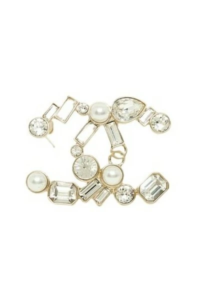 Chanel-broche van goudkleurig metaal met het motief van het CC-logo ingelegd met fancy parels en witte strass-steentjes in verschillende maten en vormen. Breedte 4,35 cm x hoogte 3,3 cm. De broche wordt geleverd zonder factuur of originele verpakking maar is in zeer goede staat, recente collectie, helder en chique.