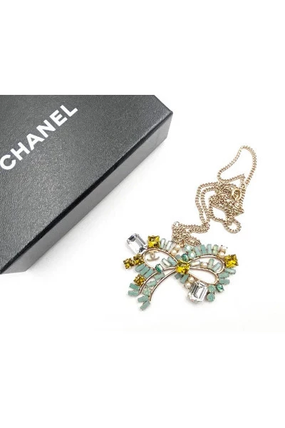 Chanel Gold CC Bow Turquoise Mosterd Crystal ketting gemarkeerd 05 gemaakt in Italië wordt geleverd met originele doos -geschikte 16