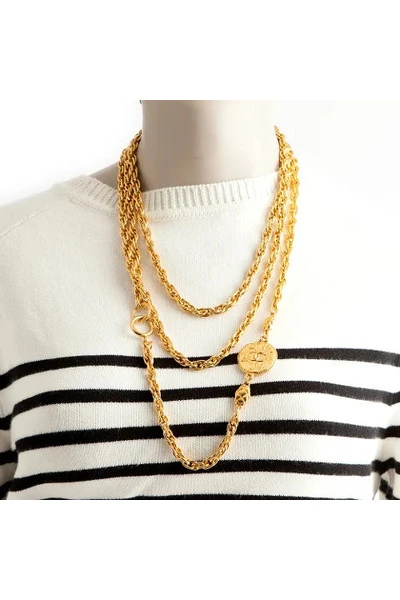 Vintage Authentieke Chanel Long Link -ketting met een CC -muntdetail. Dit verrijkte vergulde koper van Frankrijk, is gemaakt in Frankrijk en heeft een elegante ketting van de ovale schakel. Hoewel dit stuk vintage is, is het nog steeds in prachtige staat. Wordt geleverd met niet -merkbox. Grootte: 180 cm lang. Kan een enkele, 2 keer en zelfs 3 keer worden gedragen. Onze producten zijn 100% echt ; Authentiek Chanel. In sommige gevallen kopen we merchandise van vertrouwde onafhankelijke leveranciers en niet rechtstreeks van de merkeigenaar. In alle gevallen staan we bij de authenticiteit van elk product dat op deze site wordt verkocht. Uitstekend. Een uitstekend item zal een paar keer zijn gedragen en zal in bijna ongerepte staat zijn omdat het buitengewoon goed is onderhouden. Kan lichte slijtage vertonen, zoals krassen of slijtage aan de randen van worden gebruikt, maar zal geen defecten hebben.