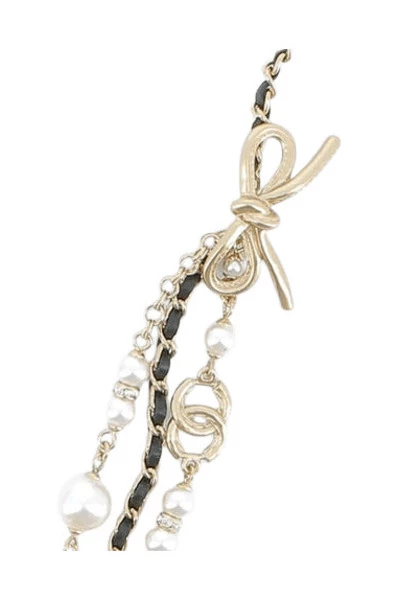 Chanel kettingegold metaalblack lederen, witte parels versierd met twee knoopsold zonder stofzak, zonder doos