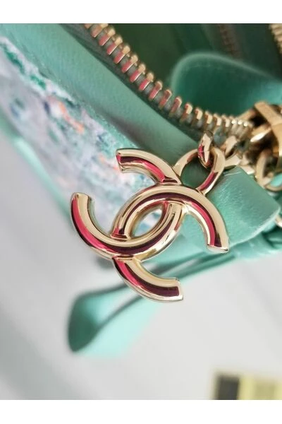 Chanel Logo Green Tweed Leather PVC Pol Clutch. We bieden een Chanel -koppeling met een perfecte vleugje kleur voor uw sping en zomerkast. Deze zeldzame pastel Chanel -koppeling biedt een mooie vrouwelijke flare. Het tweed -lichaam is bedekt met een beschermende PVC en getrimd in groen leer. De opening omvat een volledige rits en CC -logo -pull. Het lederen polsblet biedt een gemakkelijke carry. De tas s interieur is bekleed in stof met een zijkantzak en seriële sticker intact. Deze Chanel -koppeling is groot genoeg om zelfs een grote mobiele telefoon te huisvesten. METENINGEN: 11.5