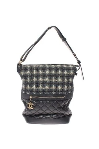 Deze Chanel Tweed en Lambskin Tote -tas Tas -tas hebben een zwarte lamskijn in maat 24*14.5*34 voor F in AB -staat.