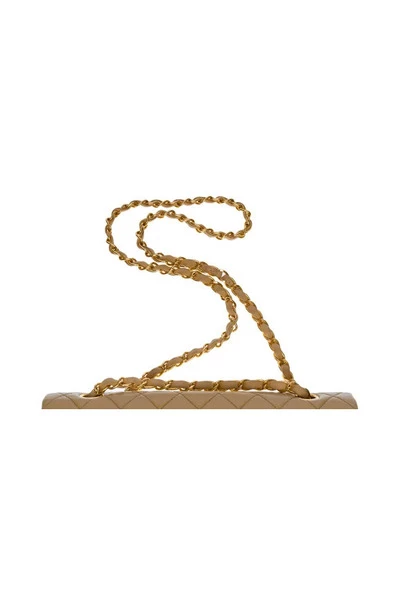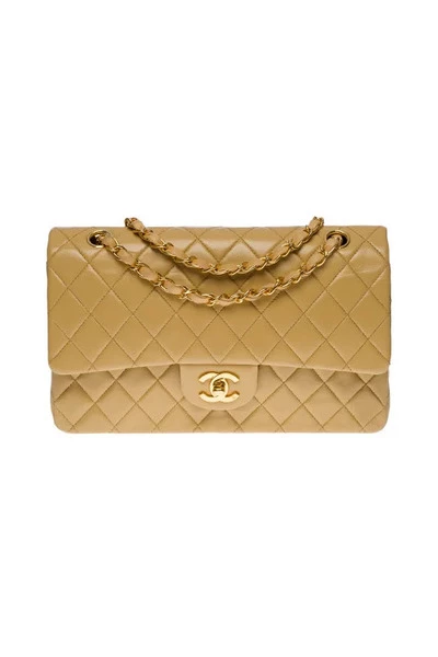 De felbegeerde Chanel Tijdeloze medium zak 25 cm met dubbele flap in beige gewatteerd leer, gouden metalen afwerking, gouden metalen ketting verweven met beige leer voor een schouder- en schouderband met schouderstrapplaat op de achterkant van de bagclosure door flap, cc golddouble flapzip op de Onderste flapplate zak aan de voorkant van de Baginline lederen voering, 1 dubbele pocket vergulde, 1 overstap naar lippenstiftsignatuur: