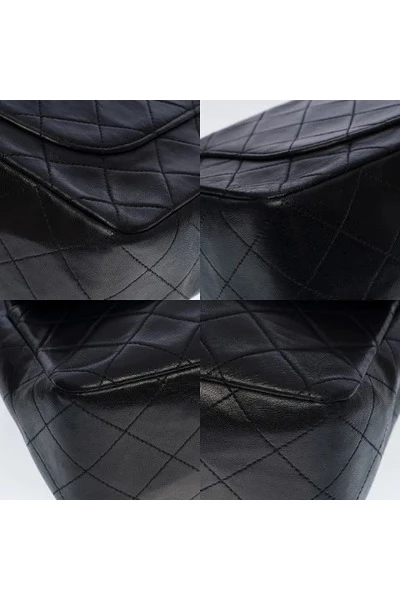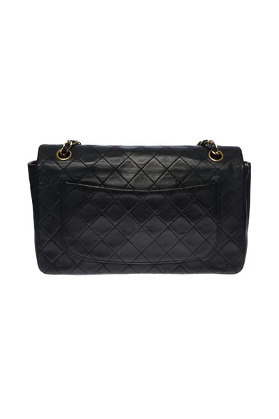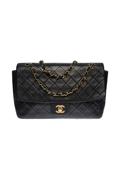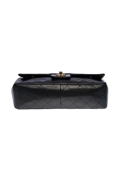 Sublieme Chanel Tijdloze/klassieke handtas 27 cm flapzak in zwart gewatteerde lamskijn, gouden metalen bekleding, een gouden metalen kettinghandgreep verweven met zwart leer voor een schouder- en schouderbandzak op de achterkant van de tasklep, gesp gemarkeerde CC Gold Single Flap Een vergulde zak en een ritssluiting aan de voorkant van de zak van de zak in bordeauxjes leer, 1 dubbele pocket, 1 overstappen naar lippenstift, twee vergulde zakken: