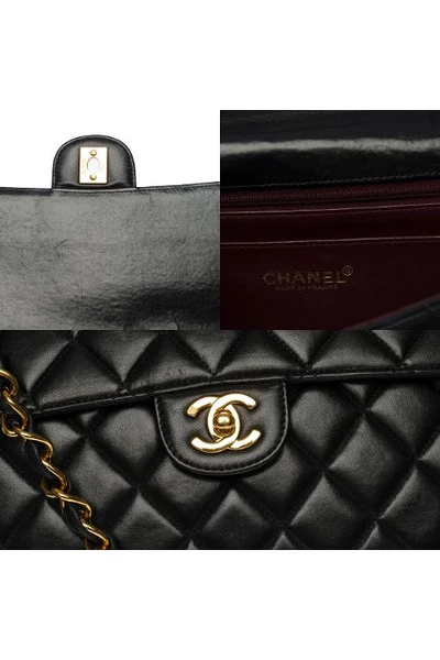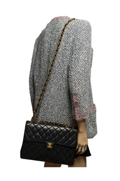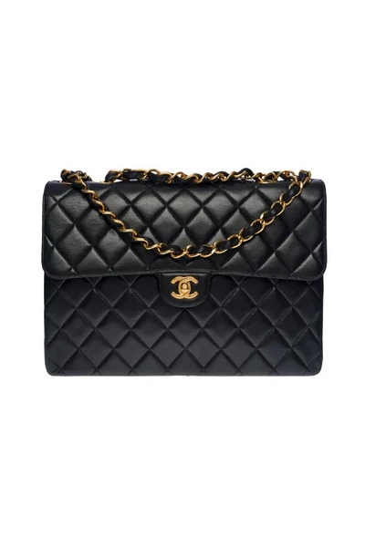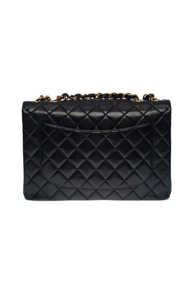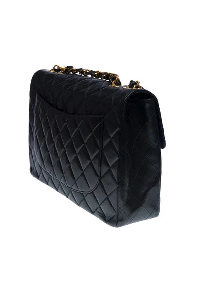 Majestueuze handtas Chanel Timeless Jumbo enkele klep in zwart gewatteerde lamsvel, gouden metalen bekleding, een gouden metalen kettinghandgreep verweven met zwart leer voor een hand en schoudersteuning geplaatst op de achterkant van de bagclosure door flap, gesp gemarkeerde CC Goldsingle Flap binnenvoering in Zwart leer, een vergulde zak, een ritssluiting met een ritssluiting: Chanel ® Made in Frankrijk Datum: 2002/2003 Afmetingen: 30 x 22 x 9 cm (12 x 9 x 3,5 inch) kettinglengte: 67 cm (26,5 inch) Referentie: 100386PACKAGING : Hologram: ja gebruikt. Een goed maar gebruikt item is gedragen en mogelijk gewassen, maar zal in goede staat zijn en goed worden verzorgd. Het item zal zichtbare slijtage hebben, maar de defecten zullen gering zijn. Deze moeten op foto`s worden genoemd en zichtbaar.