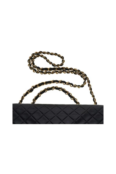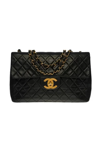 Majestic Chanel Timeless/Classic Maxi Jumbo Handtas Flap Tas in zwart gewatteerd leer, gouden metalen bekleding, een gouden metalen kettinghandgreep verweven met zwart leer voor schouder- en schouderkleding geplaatst op de achterkant van de bagclosure door flap, gesp gemarkeerd cc gouden flapdoublure inner in burgundy leather, 1 leather-plated pocket, 1 inner zipped pocket in fabricSignature: Chanel ®Made in France Date: Hologram present but illegibleDimensions: 33 x 21 x 9 cm (13 x 8.5 x 3.5 Inches)Chain length: 66 cm ( 26 inch) Referentie: 100513Packaging: Hologram: Ja (onleesbaar) Authenticiteit Kaart: Nondust Bag: Nobox: Nogenerale toestand: 6 /10in goede vintage staat ondanks tekenen van gebruik op het leer (kleine vlekken in de zak, kleine traan van 2 cm bij de Linksuiteinde van de rits en slijtage en scheuren aanwezig op de lederen link van de schouderriem) en de trim (krassen en vlekken op de trim) Optie Extra: certificering van authenticiteit door een gerechtelijke expert en in de buurt van het hof van beroep O f Paris goed, maar gebruikt. Een goed maar gebruikt item is gedragen en mogelijk gewassen, maar zal in goede staat zijn en goed worden verzorgd. Het item zal zichtbare slijtage hebben, maar de defecten zullen gering zijn. Deze moeten op foto`s worden genoemd en zichtbaar.