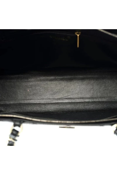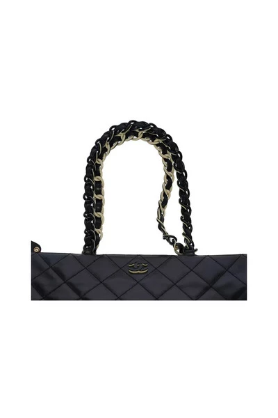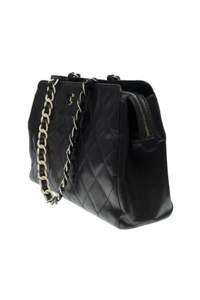 Superb Chanel Cabas handtas in zwart gewatteerd leer, zwart en ecru tweekleurige plastic bekleding, een zwarte en ecru tweekleurige plastic kettinggreep verweven met zwart leer waardoor een hand en schouder liftzip gesloten lederen binnenvoering, 1 satijnen ritssluiting, 1 leer, 1 leer mogelijk Verplatte zakken: