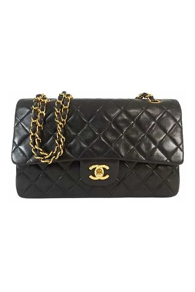 Deze schoudertas heeft een gewatteerde body van lamsleer, een achtervak aan de buitenkant, leren geweven kettingriemen, dubbele voorflappen met in elkaar grijpende C’s en een draaisluiting, en steekvakken aan de binnenkant. Klassieke medium lamsvacht dubbele flap tas Merk: Chanel