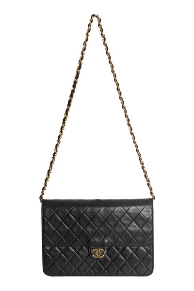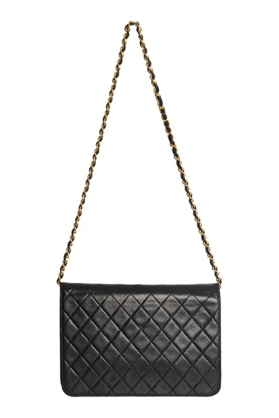 Schitterende vintage tas van zwart gewatteerd leer, hardware van verguld metaal, kettingriem van verguld metaal verweven met zwart leer waardoor de tas in de hand of op de schouder kan worden gedragen. Sluiting Met Logo In Gouden Metaal Op De Flap.