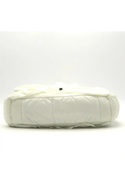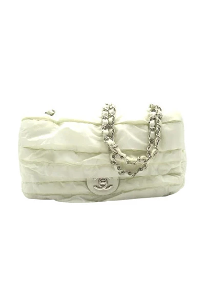 Deze chanel nylon gewatteerde flapzak schoudertas heeft een wit nylon canvas in maat 25*15*6*70 voor f in ab conditie.