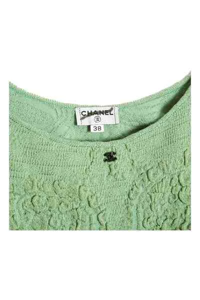 Chanel jurk van groen geblunderd viscose mesh, dunne bandjes, ronde halslijn voor en diepe halslijn afgeronde achterkant, halflang, niet gevoerd. Maat FR38: borst (plat, zonder het gaas uit te rekken) 39 cm, maat 37 cm, lengte 106 cm. De jurk dateert waarschijnlijk uit het begin van de jaren 2000, komt van particuliere verkoop, de bandjes zijn in de loop van de tijd langer geworden maar ze zijn gemakkelijk in te korten en de jurk is in een mooie algemene staat, perfect met een spijkerjasje en een paar Converse …