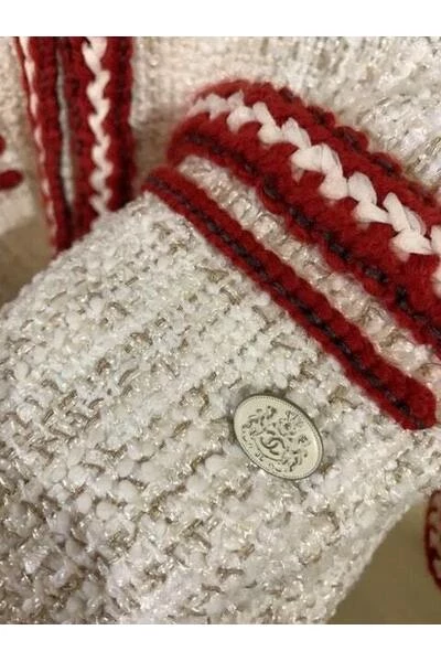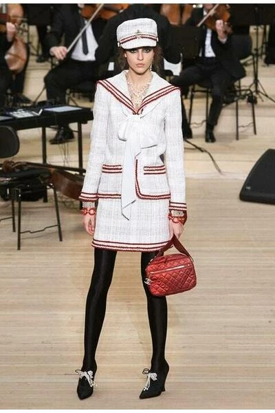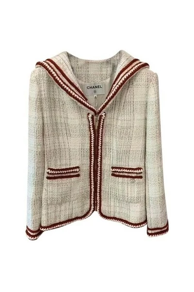 Chanel 18A Metiers dArt Paris Hamburg Runway Sailor Tweed Jas 34 FR Ecru/ Rood, met afneembare zijden sjaal. Zon mooie jas uit een geweldige collectie geïnspireerd op de haven van Hamburg, de geboortestad van Karl Lagerfeld. Verkoopprijs meer dan US $ 8k! – Chanel Paris-Hamburg Sailor Jacket 2018 – Look 20 From the Pre-Fall 2018 Métiers dArt Runway – Tweed jack met matrozenkraag – Twee zakken, ritssluiting, Chanel-versiering op zak – Zijden voering – Goudkleurige ketting aan de binnenkant van de zoom – Gemaakt in Frankrijk Authenticiteit: Alle items zijn gegarandeerd 100% authentiek. – Chanel label – Hardware gestempeld CC – Chanel zijden voering – Goudkleurige ketting aan zoom Details: Staat: uitzonderlijk Kleur: ivoor, rood, grijs **Kleur kan per monitor of apparaat verschillen. Neem contact met ons op voor specifieke kleurvragen.** Materiaal: katoen, acetaat, poly, zijde Wordt geleverd met originele Chanel Hanger